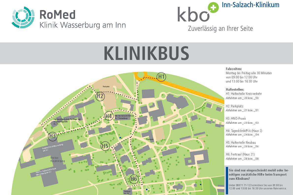 Unser gemeinsamer Klinikbus von kbo-Inn-Salzach-Klinikum und RoMed Klinik Wasserburg verbindet im 30-Minuten-Takt zentrale Haltestellen auf dem Gelände in Gabersee mit dem Neubau.
